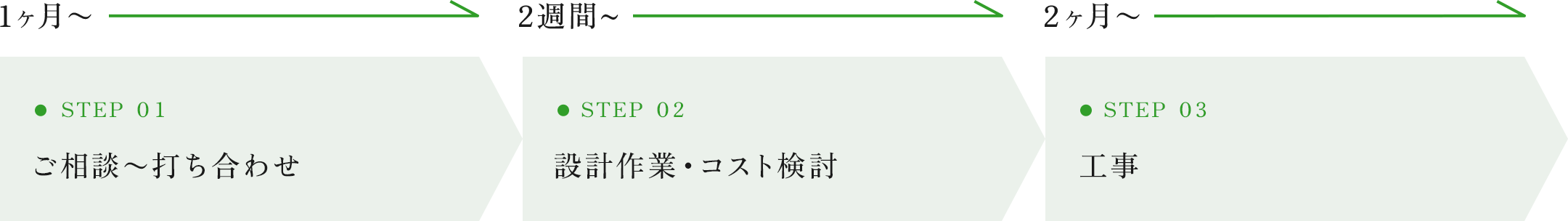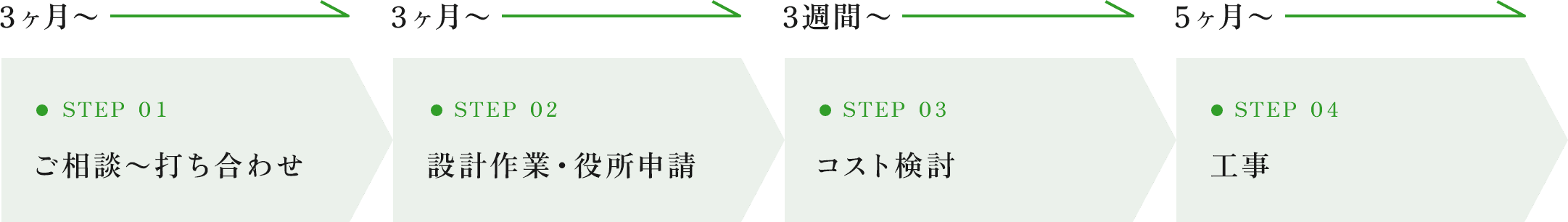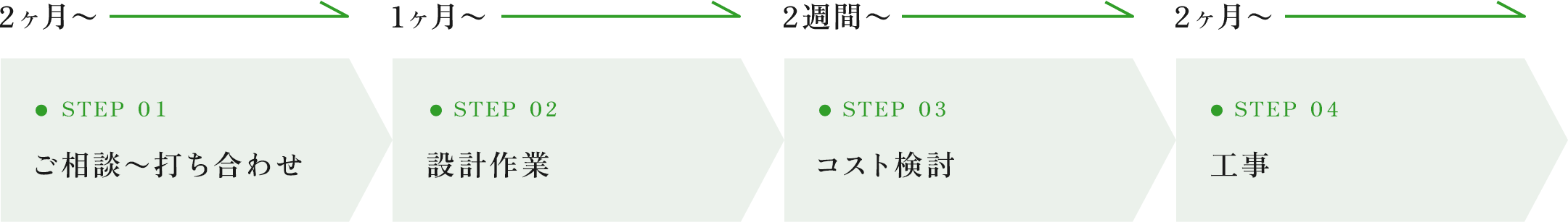 ※上記は目安です。工期は建物規模や諸条件により違います。詳細はお問い合わせください。